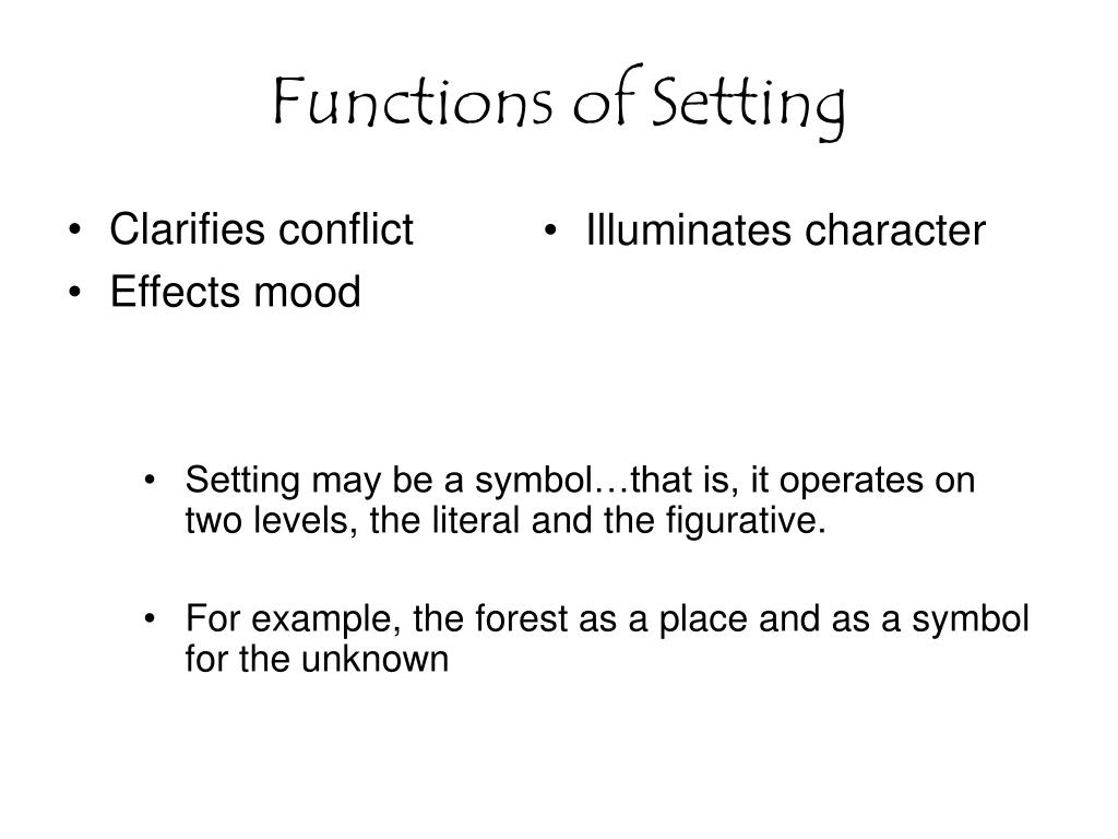 Functions of Setting Clarifies conflict Effects mood Illuminates character • Setting may be a symbol…that is, it operates on two levels, the literal and the figurative. • For example, the forest as a place and as a symbol for the unknown