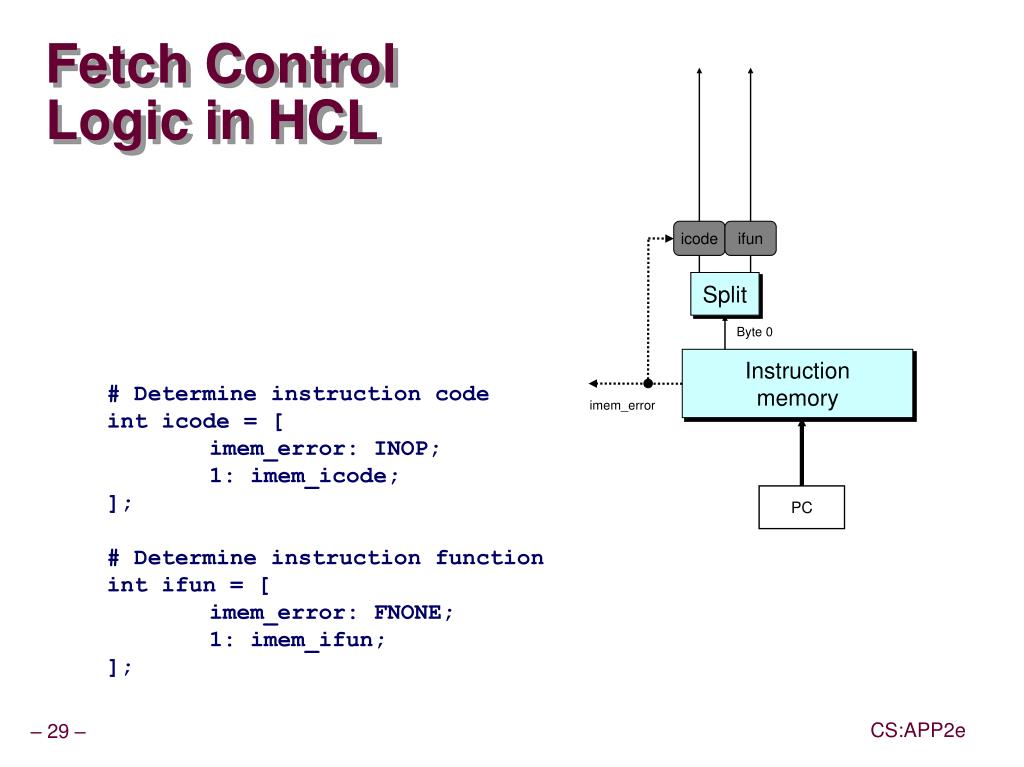 Fetch Control Logic in HCL icode ifun Split Byte 0 Instruction memory imem_error # Determine instruction code inticode = [ imem_error: INOP; 1: imem_icode; ]; # Determine instruction function intifun = [ imem_error: FNONE; 1: imem_ifun; ]; PC