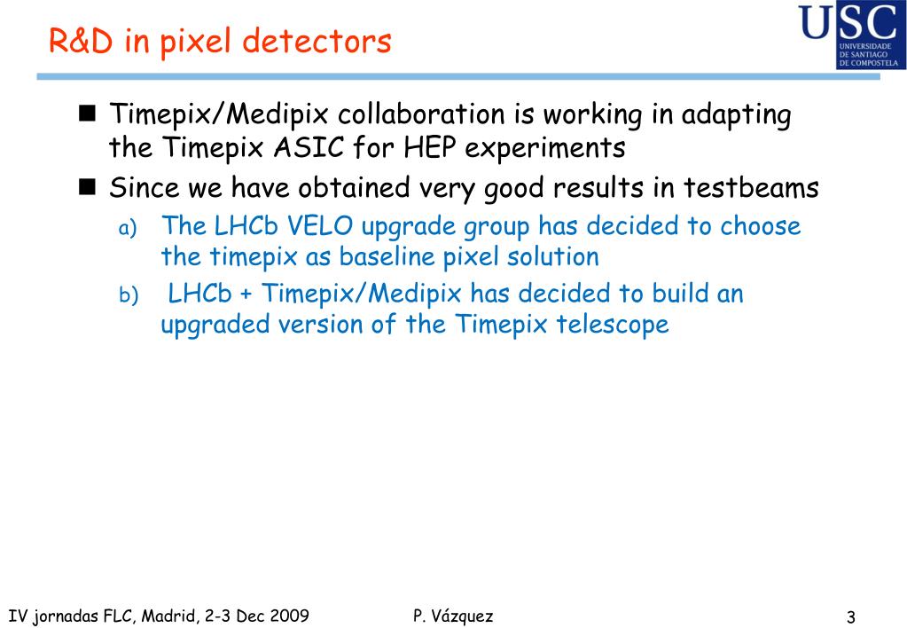 R&D in pixel detectors • Timepix/Medipixcollaborationisworking in adaptingtheTimepix ASIC for HEP experiments • Sincewehaveobtainedverygoodresults in testbeams • TheLHCb VELO upgradegroup has decidedtochoosethetimepix as baseline pixel solution • LHCb + Timepix/Medipix has decidedtobuildanupgradedversion of theTimepixtelescope IV jornadas FLC, Madrid, 2-3 Dec 2009