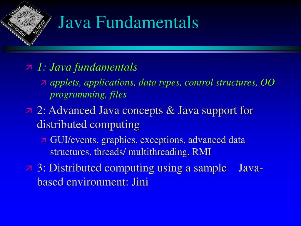 Java Fundamentals • 1: Java fundamentals • applets, applications, data types, control structures, OO programming, files • 2: Advanced Java concepts & Java support for distributed computing • GUI/events, graphics, exceptions, advanced data structures, threads/ multithreading, RMI • 3: Distributed computing using a sample Java-based environment: Jini