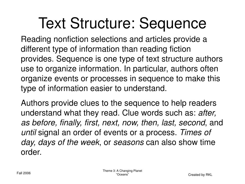Text Structure: Sequence Reading nonfiction selections and articles provide a different type of information than reading fiction provides. Sequence is one type of text structure authors use to organize information. In particular, authors often organize events or processes in sequence to make this type of information easier to understand. Authors provide clues to the sequence to help readers understand what they read. Clue words such as: after, as before, finally, first, next, now, then, last, second, and until signal an order of events or a process. Times of day, days of the week, or seasons can also show time order. Theme 3: A Changing Planet “Oceans”