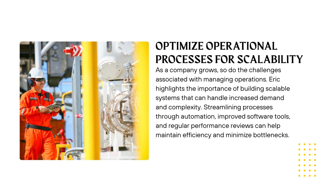 OPTIMIZE OPERATIONAL PROCESSES FOR SCALABILITY As a company grows, so do the challenges associated with managing operations. Eric highlights the importance of building scalable systems that can handle increased demand and complexity. Streamlining processes through automation, improved software tools, and regular performance reviews can help maintain efficiency and minimize bottlenecks.