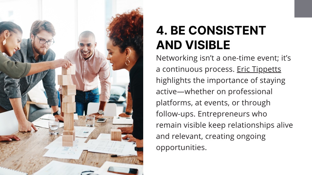 4. BE CONSISTENT AND VISIBLE Networking isn’t a one-time event; it’s a continuous process. Eric Tippetts highlights the importance of staying active—whether on professional platforms, at events, or through follow-ups. Entrepreneurs who remain visible keep relationships alive and relevant, creating ongoing opportunities.
