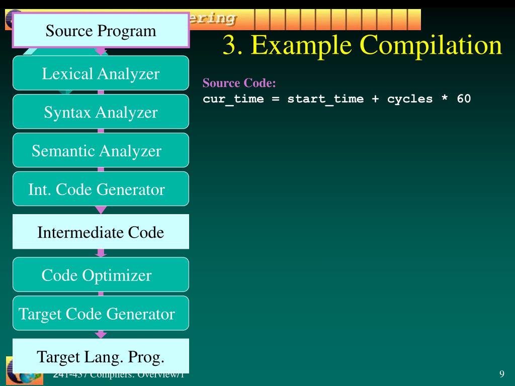 Code Optimizer Target Code Generator Source Program 3. Example Compilation Lexical Analyzer Source Code: cur_time = start_time + cycles * 60 Syntax Analyzer Semantic Analyzer Int. Code Generator Intermediate Code Target Lang. Prog.