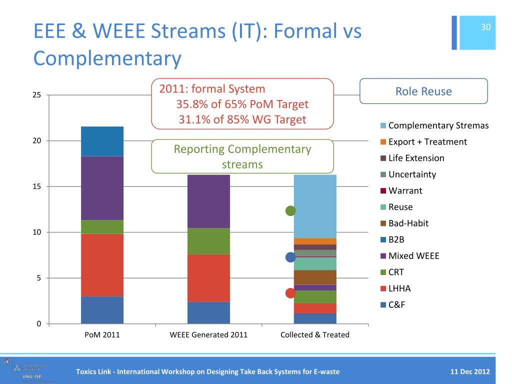 EEE & WEEE Streams (IT): Formal vs Complementary 2011: formal System 35.8% of 65% PoM Target 31.1% of 85% WG Target RoleReuse Reporting Complementarystreams Toxics Link - International Workshop on Designing Take Back Systems for E-waste