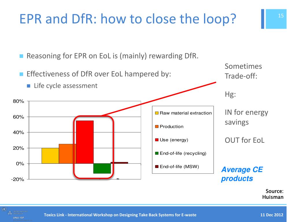 Average CE products EPR and DfR: how to close the loop? Sometimes Trade-off: Hg: IN for energy savings OUT for EoL Source: Huisman Toxics Link - International Workshop on Designing Take Back Systems for E-waste • Reasoning for EPR on EoL is (mainly) rewarding DfR. • Effectiveness of DfR over EoL hampered by: • Life cycle assessment