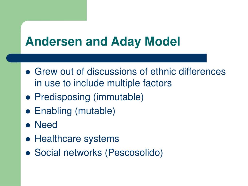 Andersen and Aday • Predisposing, enabling, need and systems factors modulated by social networks produce a calculus of decision on whether to visit and where to visit • Individual decision • Group decision