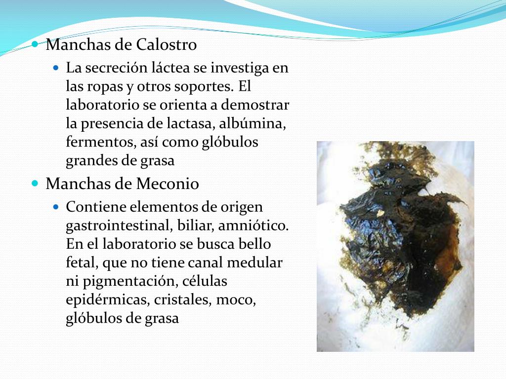 Manchas de Calostro • La secreción láctea se investiga en las ropas y otros soportes. El laboratorio se orienta a demostrar la presencia de lactasa, albúmina, fermentos, así como glóbulos grandes de grasa • Manchas de Meconio • Contiene elementos de origen gastrointestinal, biliar, amniótico. En el laboratorio se busca bello fetal, que no tiene canal medular ni pigmentación, células epidérmicas, cristales, moco, glóbulos de grasa