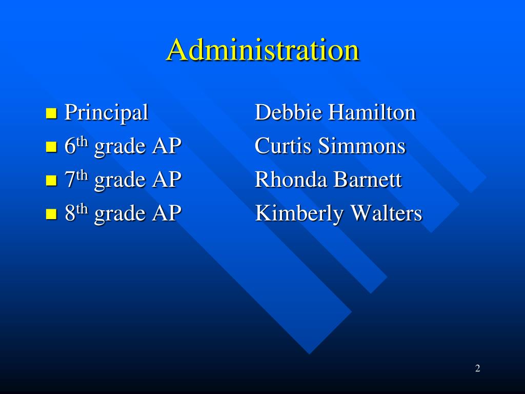 Administration • Principal Debbie Hamilton • 6th grade AP Curtis Simmons • 7th grade AP Rhonda Barnett • 8th grade AP Kimberly Walters