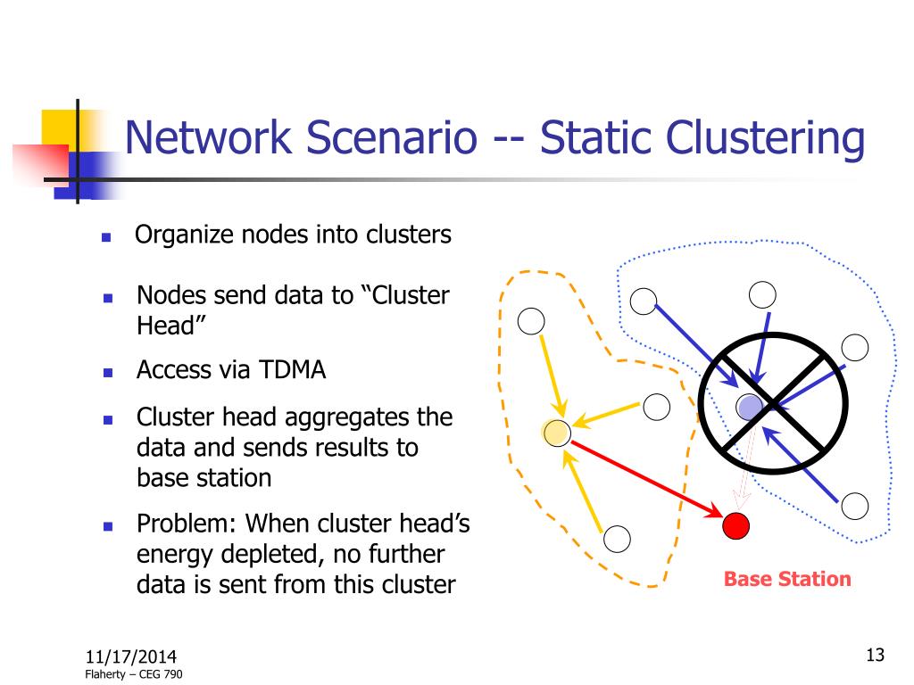 Nodes send data to “Cluster Head” • Access via TDMA • Cluster head aggregates the data and sends results to base station • Problem: When cluster head’s energy depleted, no further data is sent from this cluster Network Scenario -- Static Clustering • Organize nodes into clusters Base Station