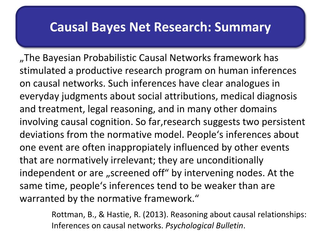 CausalBayes Net Research: Summary „The BayesianProbabilisticCausal Networks frameworkhasstimulated a productiveresearchprogram on human inferences on causalnetworks. Such inferenceshaveclearanalogues in everydayjudgmentsaboutsocialattributions, medicaldiagnosisandtreatment, legal reasoning, and in manyotherdomainsinvolvingcausalcognition. So far,researchsuggeststwo persistent deviationsfromthe normative model. People‘sinferencesaboutoneeventareofteninappropiatelyinfluencedbyothereventsthatarenormatively irrelevant; theyareunconditionallyindependentorare „screened off“ byinterveningnodes. Atthe same time, people‘sinferencestendtobeweakerthanarewarrantedbythe normative framework.“ Rottman, B., & Hastie, R. (2013). Reasoningaboutcausalrelationships: Inferenceson causalnetworks. Psychological Bulletin.