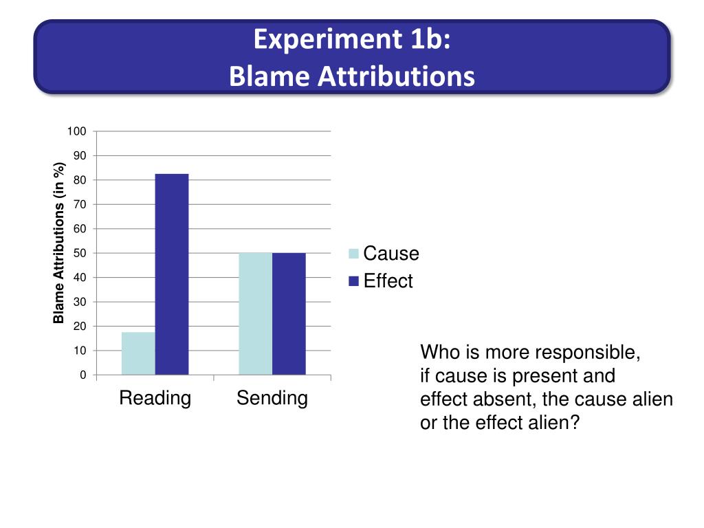 Experiment 1b: Blame Attributions Who ismoreresponsible, ifcauseispresent and effect absent, thecausealienortheeffectalien?