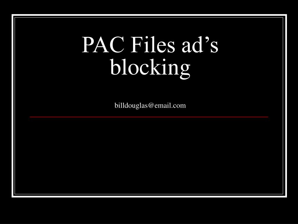 PAC Files ad’s blocking billdouglas@email.com. [Pac] files. A file saved with .pac extension Java script for- Find proxy for URL () Open in word pad as notepad will not show the line breaks. Pcmag p70fall 2004. Free ad blocking pac files. --can be downloaded