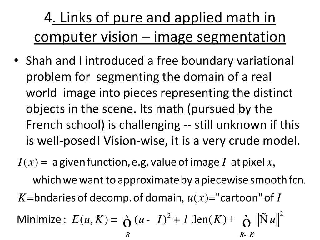 4. Links of pure and applied math in computer vision – image segmentation • Shah and I introduced a free boundary variational problem for segmenting the domain of a real world image into pieces representing the distinct objects in the scene. Its math (pursued by the French school) is challenging -- still unknown if this is well-posed! Vision-wise, it is a very crude model.