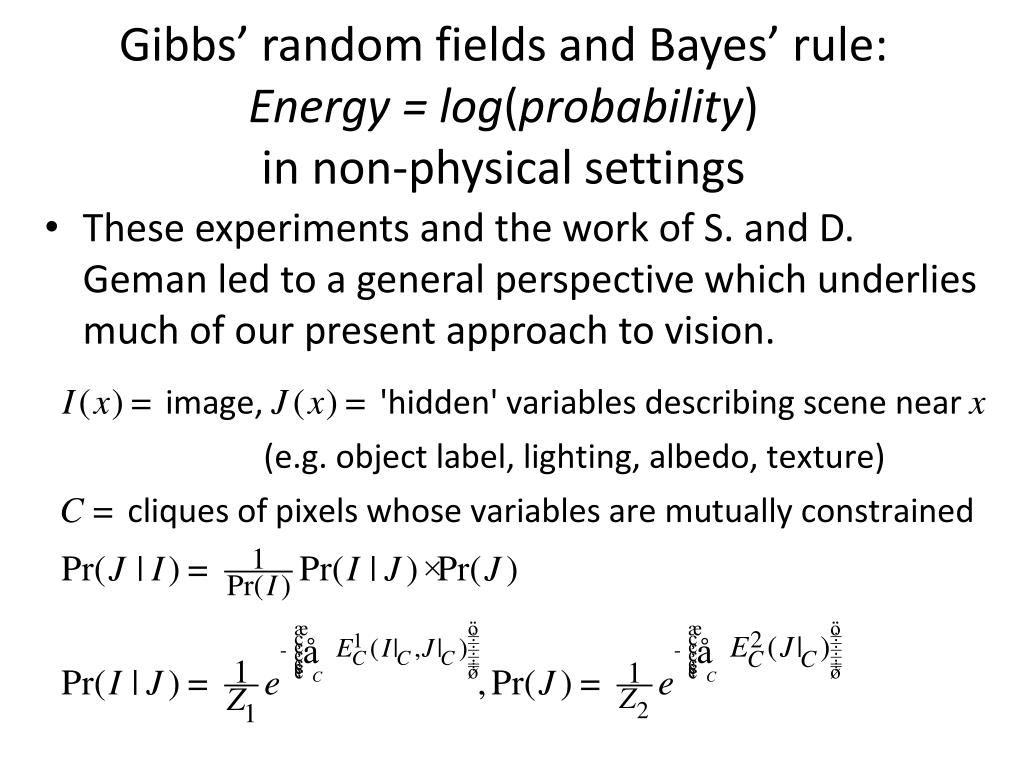 Gibbs’ random fields and Bayes’ rule:Energy = log(probability) in non-physical settings • These experiments and the work of S. and D. Geman led to a general perspective which underlies much of our present approach to vision.