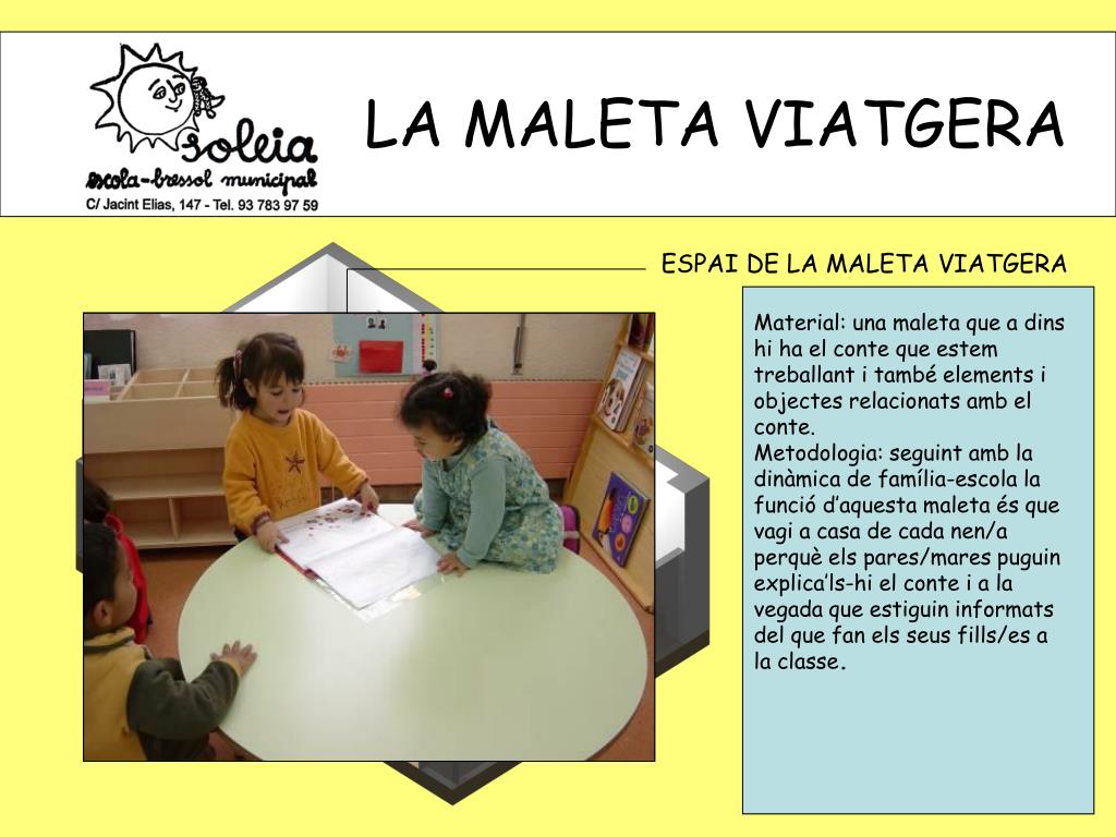 LA MALETA VIATGERA ESPAI DE LA MALETA VIATGERA Material: una maleta que a dins hi ha el conte que estem treballant i també elements i objectes relacionats amb el conte. Metodologia: seguint amb la dinàmica de família-escola la funció d’aquesta maleta és que vagi a casa de cada nen/a perquè els pares/mares puguin explica’ls-hi el conte i a la vegada que estiguin informats del que fan els seus fills/es a la classe.