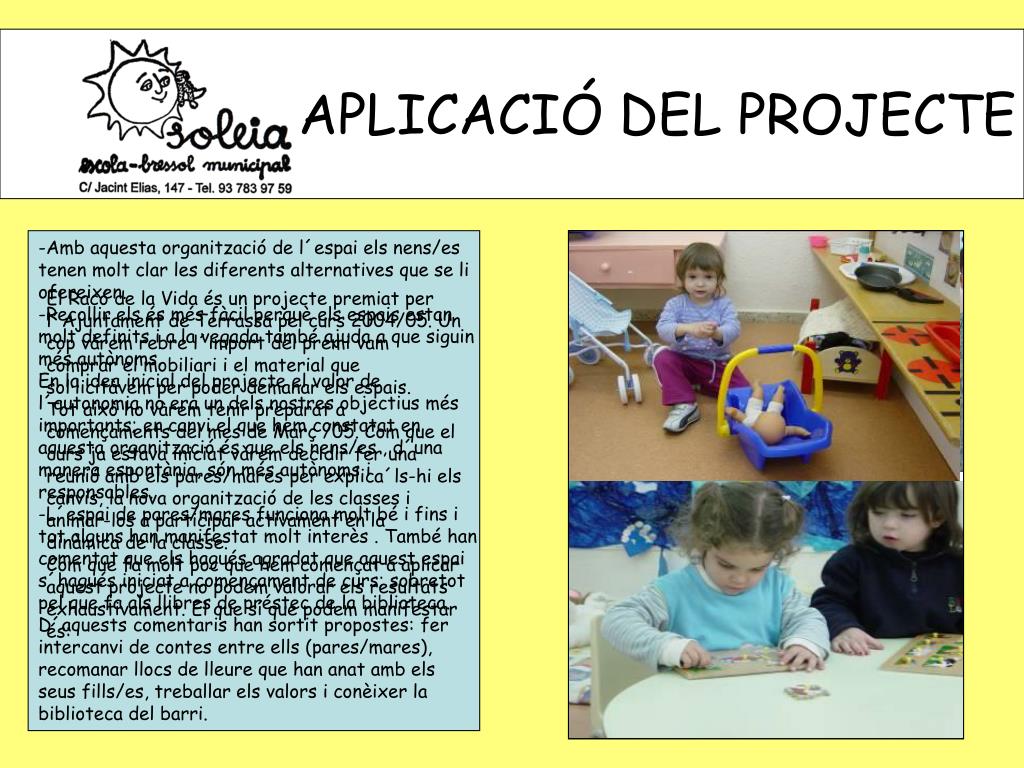 APLICACIÓ DEL PROJECTE -Amb aquesta organització de l´espai els nens/es tenen molt clar les diferents alternatives que se li ofereixen. -Recollir els és més fàcil perquè els espais estan molt definits i a la vegada també ajuda a que siguin més autònoms. En la idea inicial del projecte el valor de l´autonomia no era un dels nostres objectius més importants; en canvi el que hem constatat en aquesta organització és que els nens/es , d´una manera espontània, són més autònoms i responsables. -L´espai de pares/mares funciona molt bé i fins i tot alguns han manifestat molt interès . També han comentat que els hagués agradat que aquest espai s´hagués iniciat a començament de curs; sobretot pel que fa als llibres de préstec de la biblioteca. D´aquests comentaris han sortit propostes: fer intercanvi de contes entre ells (pares/mares), recomanar llocs de lleure que han anat amb els seus fills/es, treballar els valors i conèixer la biblioteca del barri. El Racó de la Vida és un projecte premiat per l´Ajuntament de Terrassa pel curs 2004/05. Un cop vàrem rebre l´import del premi vam comprar el mobiliari i el material que sol·licitàvem per poder demanar els espais. Tot això ho vàrem tenir preparat a començaments del mes de Març /05. Com que el curs ja estava iniciat vàrem decidir fer una reunió amb els pares/mares per explica´ls-hi els canvis, la nova organització de les classes i animar-los a participar activament en la dinàmica de la classe. Com que fa molt poc que hem començat a aplicar aquest projecte no podem valorar els resultats exhaustivament. El que sí que podem manifestar és: