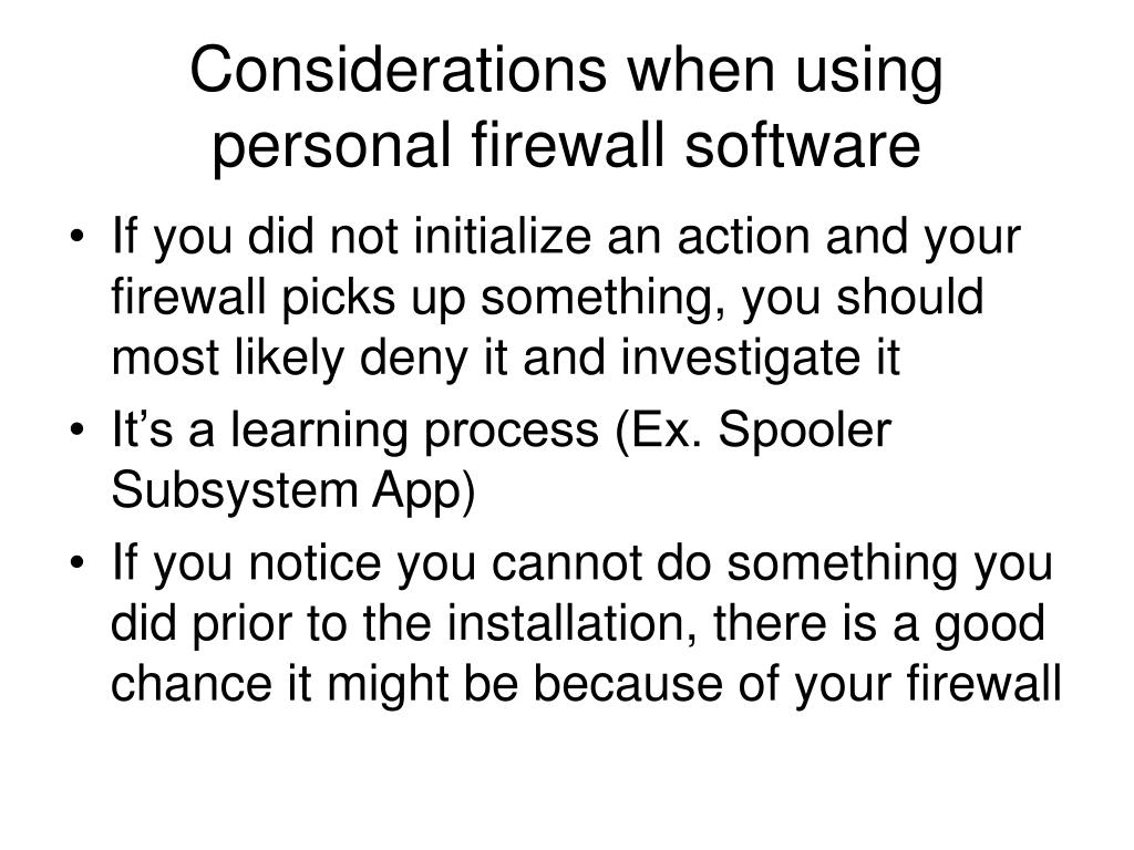 Considerations when using personal firewall software • If you did not initialize an action and your firewall picks up something, you should most likely deny it and investigate it • It’s a learning process (Ex. Spooler Subsystem App) • If you notice you cannot do something you did prior to the installation, there is a good chance it might be because of your firewall