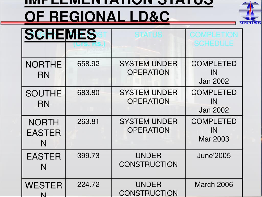 Modernisation of RLDCs • Three RLDCs namely Northern, Southern & North-Eastern Regions have been modernised at an cost of about Rs. 1600 Crs. • Mordernisation of Eastern & Western Regions RLDCs underway. • Estimated cost : Rs. 564 Crs. • Schedule : ER by June ’05 & WR by March’06