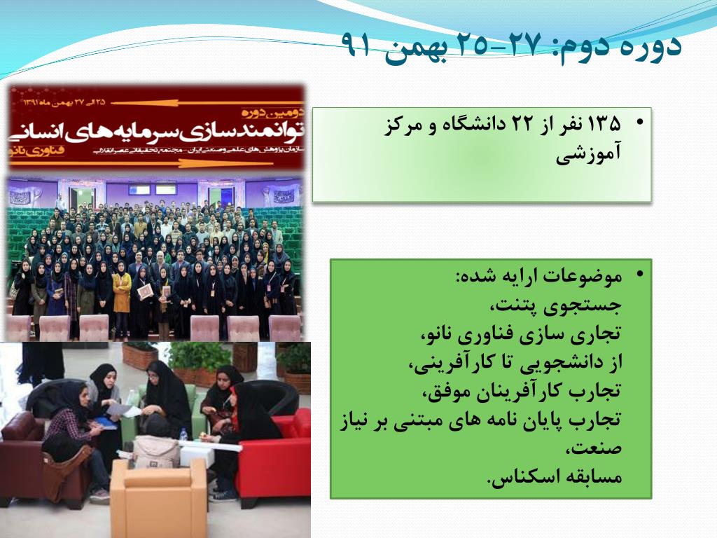 دوره دوم: 27-25 بهمن 91 • 135 نفر از 22 دانشگاه و مرکز آموزشی • موضوعات ارایه شده:جستجوی پتنت،تجاری سازی فناوری نانو،از دانشجویی تا کارآفرینی،تجارب کارآفرینان موفق،تجارب پایان نامه های مبتنی بر نیاز صنعت،مسابقه اسکناس.