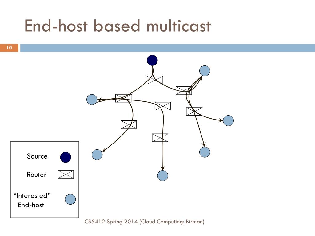 End-host based multicast Source Router “Interested” End-host CS5412 Spring 2014 (Cloud Computing: Birman)