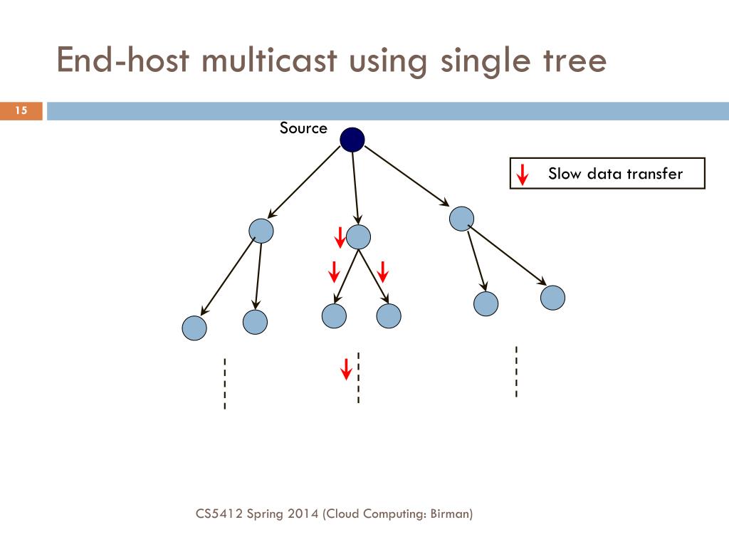 End-host multicast using single tree Source Slow data transfer CS5412 Spring 2014 (Cloud Computing: Birman)