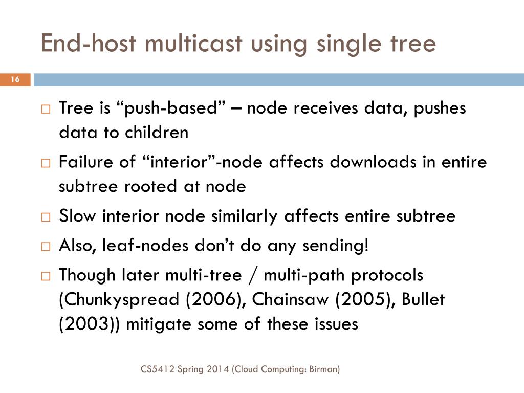 End-host multicast using single tree • Tree is “push-based” – node receives data, pushes data to children • Failure of “interior”-node affects downloads in entire subtree rooted at node • Slow interior node similarly affects entire subtree • Also, leaf-nodes don’t do any sending! • Though later multi-tree / multi-path protocols (Chunkyspread (2006), Chainsaw (2005), Bullet (2003)) mitigate some of these issues CS5412 Spring 2014 (Cloud Computing: Birman)