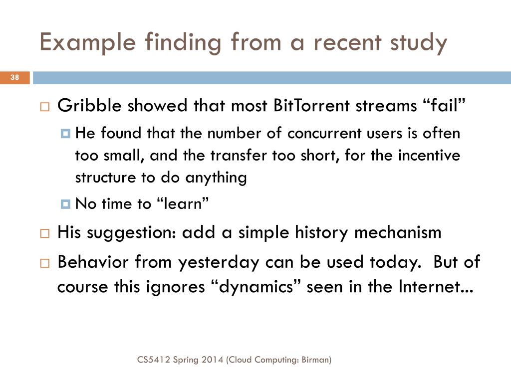 Example finding from a recent study • Gribble showed that most BitTorrent streams “fail” • He found that the number of concurrent users is often too small, and the transfer too short, for the incentive structure to do anything • No time to “learn” • His suggestion: add a simple history mechanism • Behavior from yesterday can be used today. But of course this ignores “dynamics” seen in the Internet... CS5412 Spring 2014 (Cloud Computing: Birman)