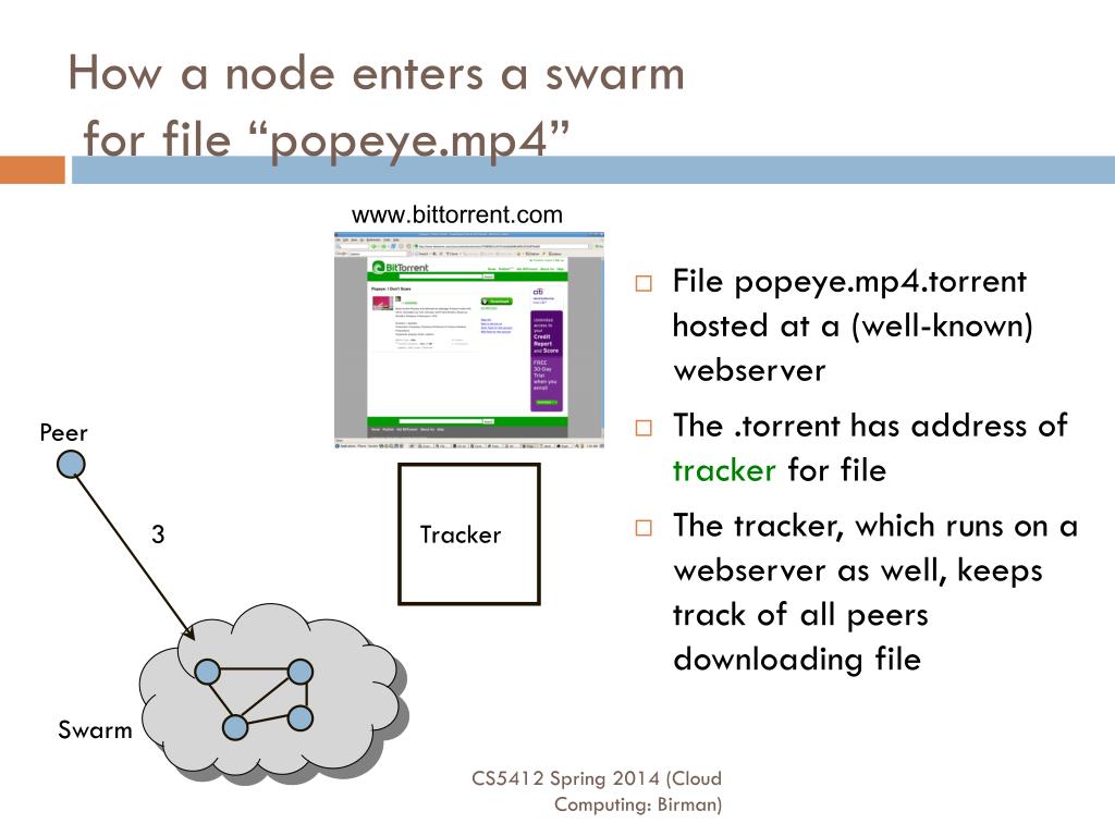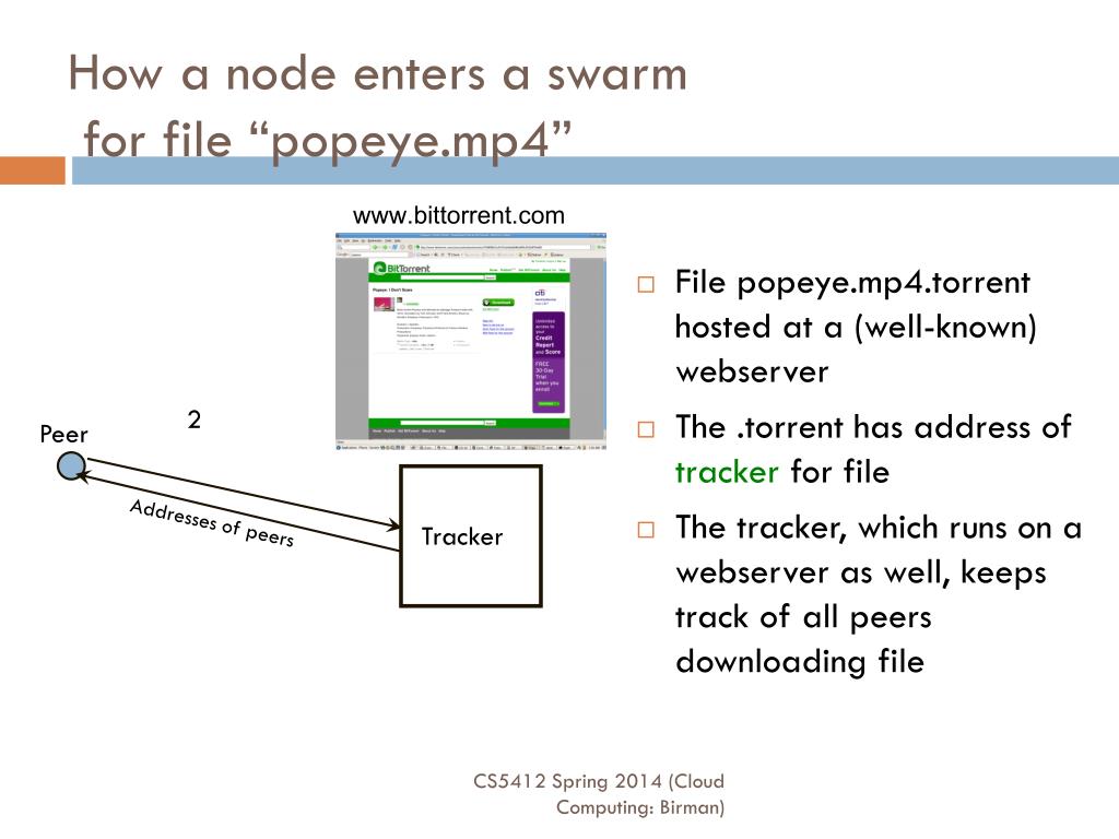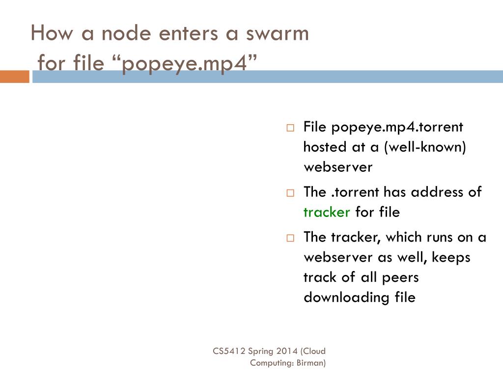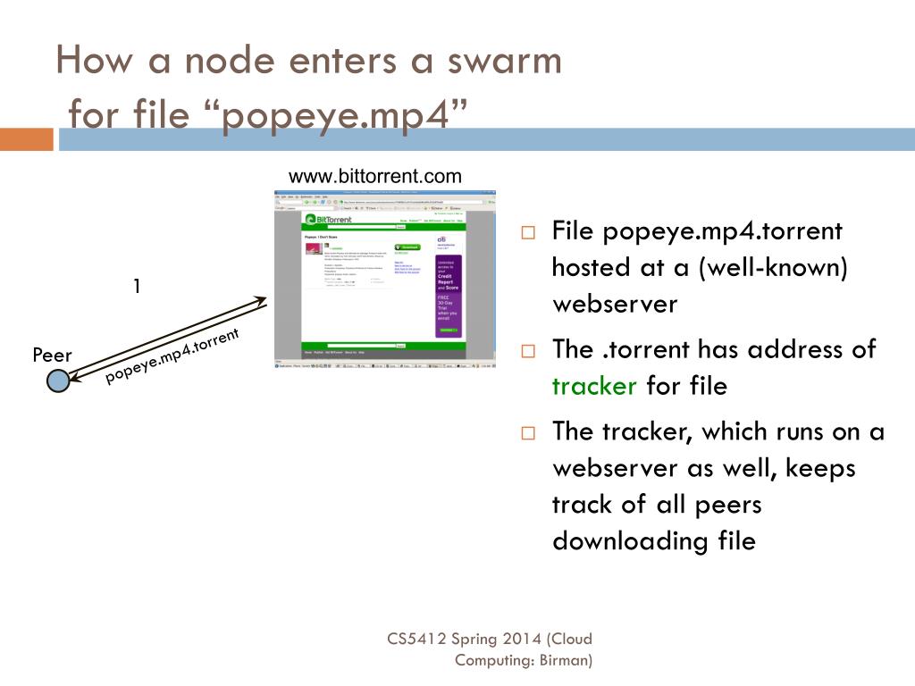 How a node enters a swarm for file “popeye.mp4” • File popeye.mp4.torrent hosted at a (well-known) webserver • The .torrent has address of tracker for file • The tracker, which runs on a webserver as well, keeps track of all peers downloading file CS5412 Spring 2014 (Cloud Computing: Birman)