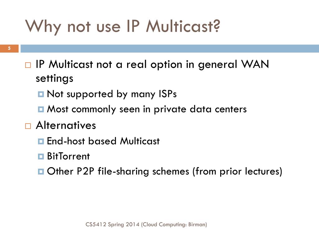 Why not use IP Multicast? • IP Multicast not a real option in general WAN settings • Not supported by many ISPs • Most commonly seen in private data centers • Alternatives • End-host based Multicast • BitTorrent • Other P2P file-sharing schemes (from prior lectures) CS5412 Spring 2014 (Cloud Computing: Birman)