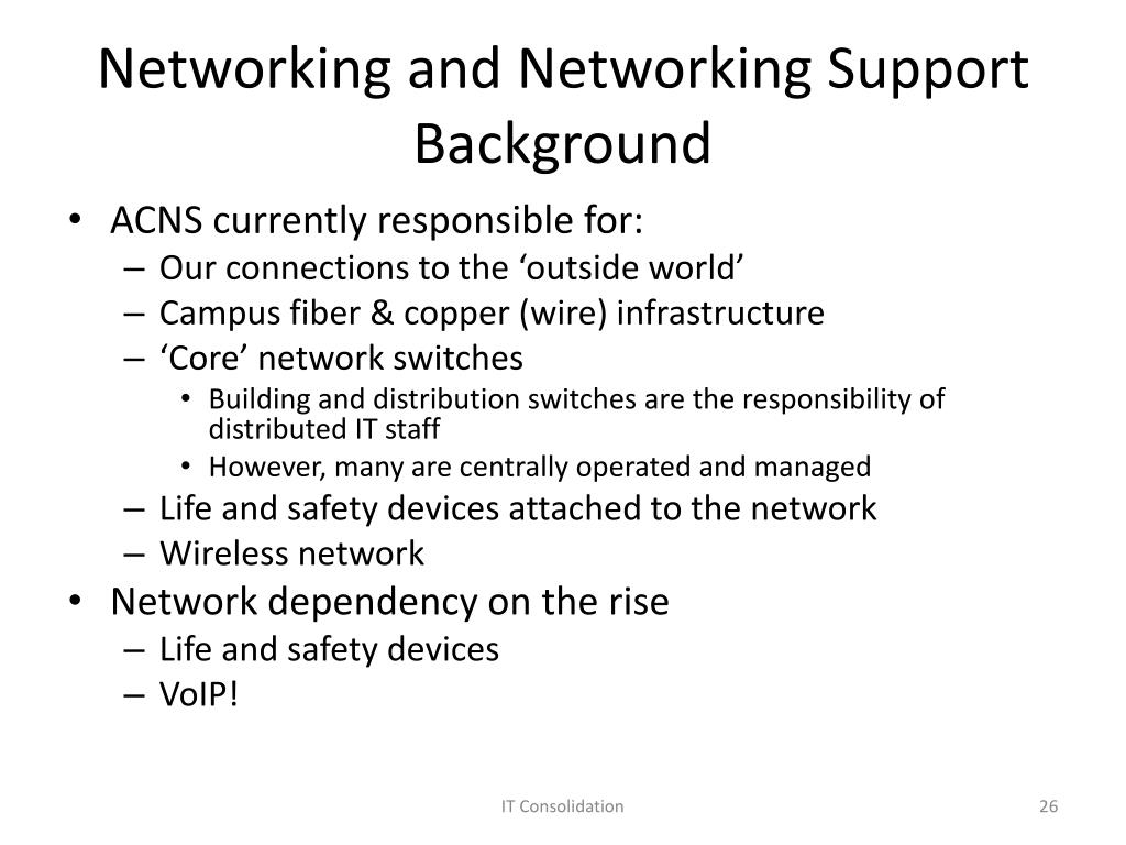 Networking and Networking SupportBackground • ACNS currently responsible for: • Our connections to the ‘outside world’ • Campus fiber & copper (wire) infrastructure • ‘Core’ network switches • Building and distribution switches are the responsibility of distributed IT staff • However, many are centrally operated and managed • Life and safety devices attached to the network • Wireless network • Network dependency on the rise • Life and safety devices • VoIP! IT Consolidation