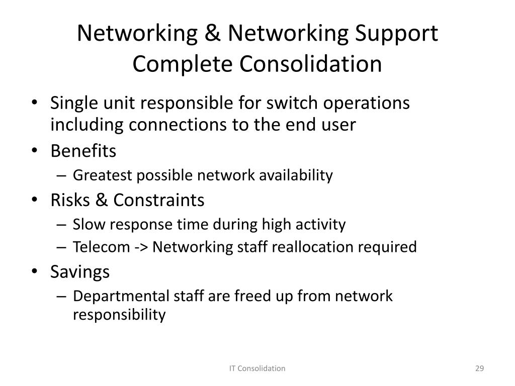 Networking & Networking SupportComplete Consolidation • Single unit responsible for switch operations including connections to the end user • Benefits • Greatest possible network availability • Risks & Constraints • Slow response time during high activity • Telecom -> Networking staff reallocation required • Savings • Departmental staff are freed up from network responsibility IT Consolidation