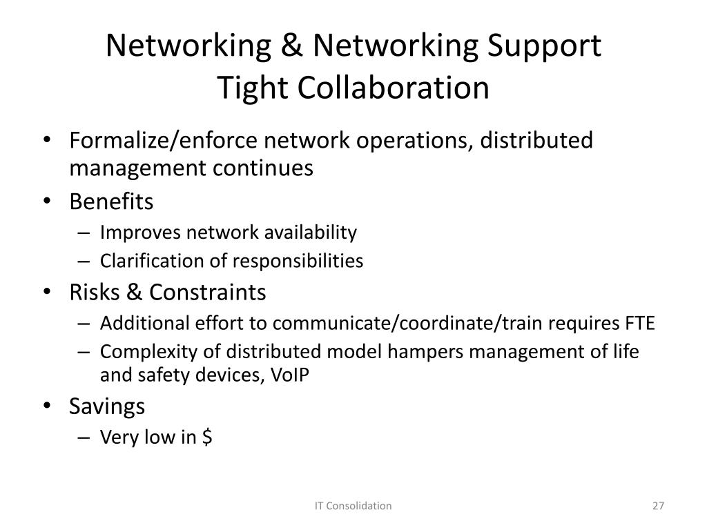 Networking & Networking SupportTight Collaboration • Formalize/enforce network operations, distributed management continues • Benefits • Improves network availability • Clarification of responsibilities • Risks & Constraints • Additional effort to communicate/coordinate/train requires FTE • Complexity of distributed model hampers management of life and safety devices, VoIP • Savings • Very low in $ IT Consolidation