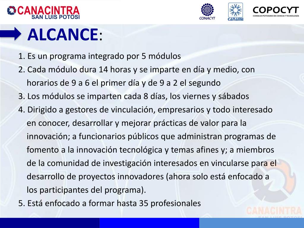 ALCANCE: 1. Es un programa integrado por 5 módulos 2. Cada módulo dura 14 horas y se imparte en día y medio, con horarios de 9 a 6 el primer día y de 9 a 2 el segundo 3. Los módulos se imparten cada 8 días, los viernes y sábados 4. Dirigido a gestores de vinculación, empresarios y todo interesado en conocer, desarrollar y mejorar prácticas de valor para la innovación; a funcionarios públicos que administran programas de fomento a la innovación tecnológica y temas afines y; a miembros de la comunidad de investigación interesados en vincularse para el desarrollo de proyectos innovadores (ahora solo está enfocado a los participantes del programa). 5. Está enfocado a formar hasta 35 profesionales