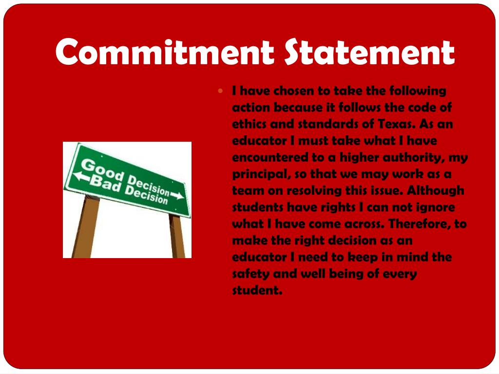 Commitment Statement • I have chosen to take the following action because it follows the code of ethics and standards of Texas. As an educator I must take what I have encountered to a higher authority, my principal, so that we may work as a team on resolving this issue. Although students have rights I can not ignore what I have come across. Therefore, to make the right decision as an educator I need to keep in mind the safety and well being of every student.