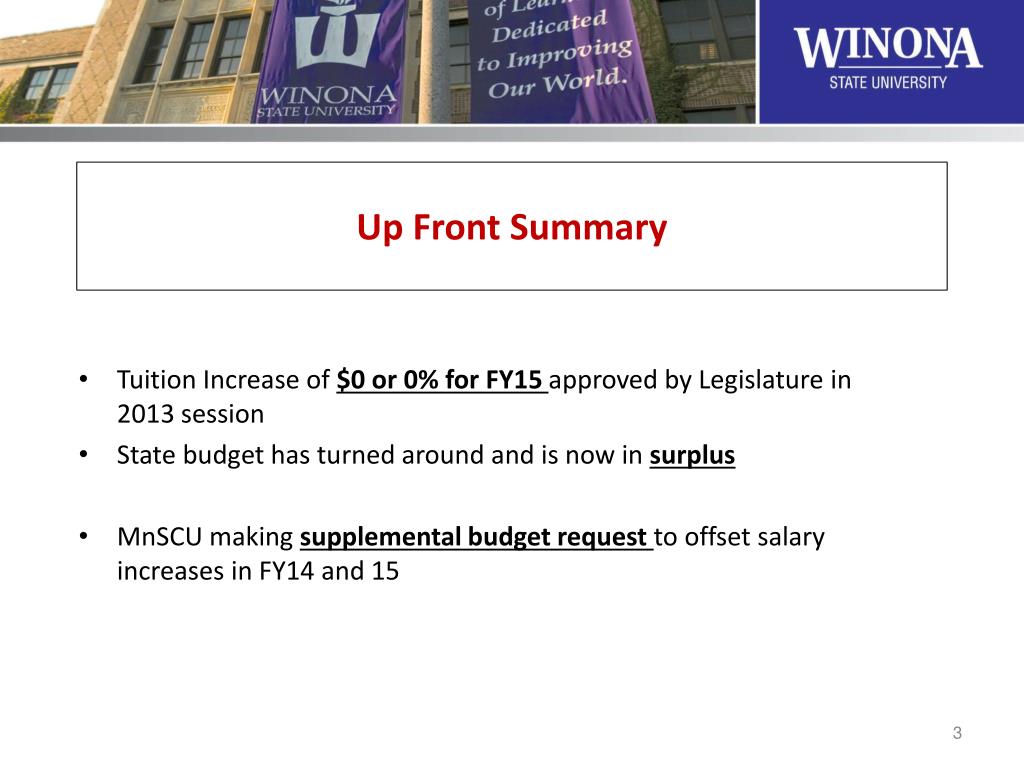 Up Front Summary • Tuition Increase of $0 or 0% for FY15 approved by Legislature in 2013 session • State budget has turned around and is now in surplus • MnSCU making supplemental budget request to offset salary increases in FY14 and 15
