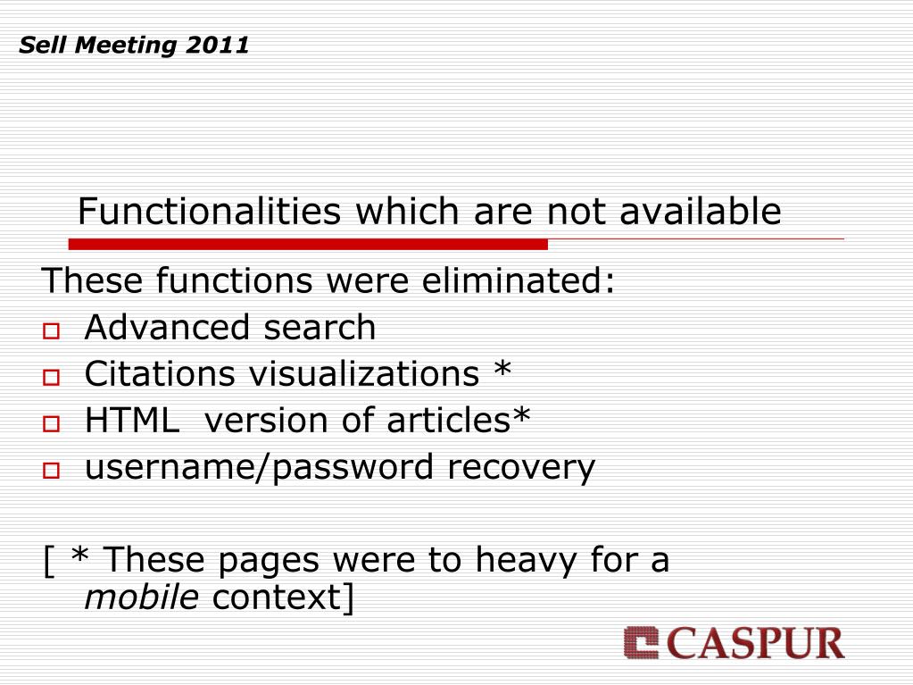 Sell Meeting 2011 Functionalities which are not available These functions were eliminated: • Advanced search • Citations visualizations * • HTML version of articles* • username/password recovery [ * These pages were to heavy for a mobile context]