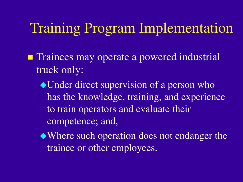 Training Program Implementation • Trainees may operate a powered industrial truck only: • Under direct supervision of a person who has the knowledge, training, and experience to train operators and evaluate their competence; and, • Where such operation does not endanger the trainee or other employees.