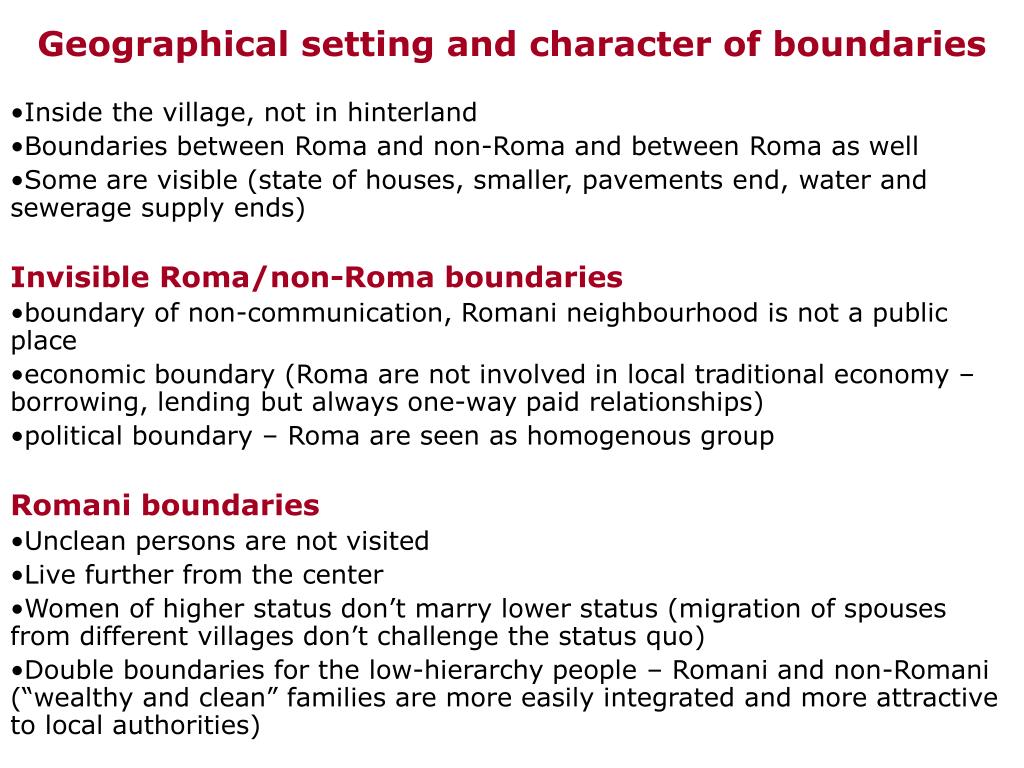 Geographical setting and character of boundaries • Inside the village, not in hinterland • Boundaries between Roma and non-Roma and between Roma as well • Some are visible (state of houses, smaller, pavements end, water and sewerage supply ends) • Invisible Roma/non-Roma boundaries • boundary of non-communication, Romani neighbourhood is not a public place • economic boundary (Roma are not involved in local traditional economy – borrowing, lending but always one-way paid relationships) • political boundary – Roma are seen as homogenous group • Romani boundaries • Unclean persons are not visited • Live further from the center • Women of higher status don’t marry lower status (migration of spouses from different villages don’t challenge the status quo) • Double boundaries for the low-hierarchy people – Romani and non-Romani (“wealthy and clean” families are more easily integrated and more attractive to local authorities)