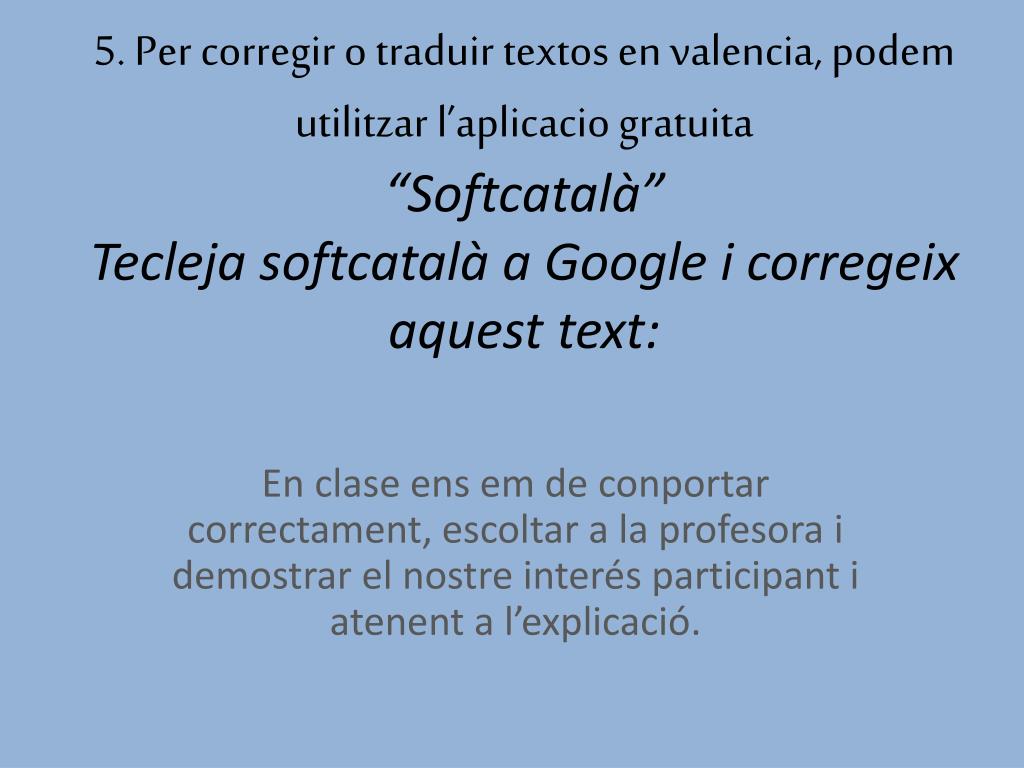 5. Per corregir o traduir textos en valencia, podemutilitzarl’aplicacio gratuita“Softcatalà” Teclejasoftcatalà a Google i corregeixaquesttext: En clase ensem de conportarcorrectament, escoltar a la profesora i demostrar el nostre interés participant i atenent a l’explicació.