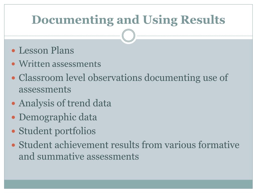 Documenting and Using Results • Lesson Plans • Written assessments • Classroom level observations documenting use of assessments • Analysis of trend data • Demographic data • Student portfolios • Student achievement results from various formative and summative assessments