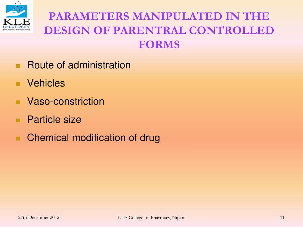 PARAMETERS MANIPULATED IN THE DESIGN OF PARENTRAL CONTROLLED FORMS Route of administration Vehicles Vaso-constriction Particle size Chemical modification of drug 11 KLE College of Pharmacy, Nipani