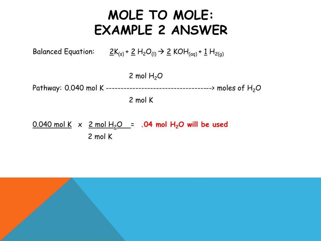 Mole to Mole: Example 2 Answer • Balanced Equation: 2K(s) + 2 H2O(l) 2KOH(aq) + 1 H2(g) • 2 molH2O • Pathway: 0.040 mol K ------------------------------------> moles of H2O • 2 mol K • 0.040 mol K x 2 molH2O = .04 molH2O will be used • 2 mol K