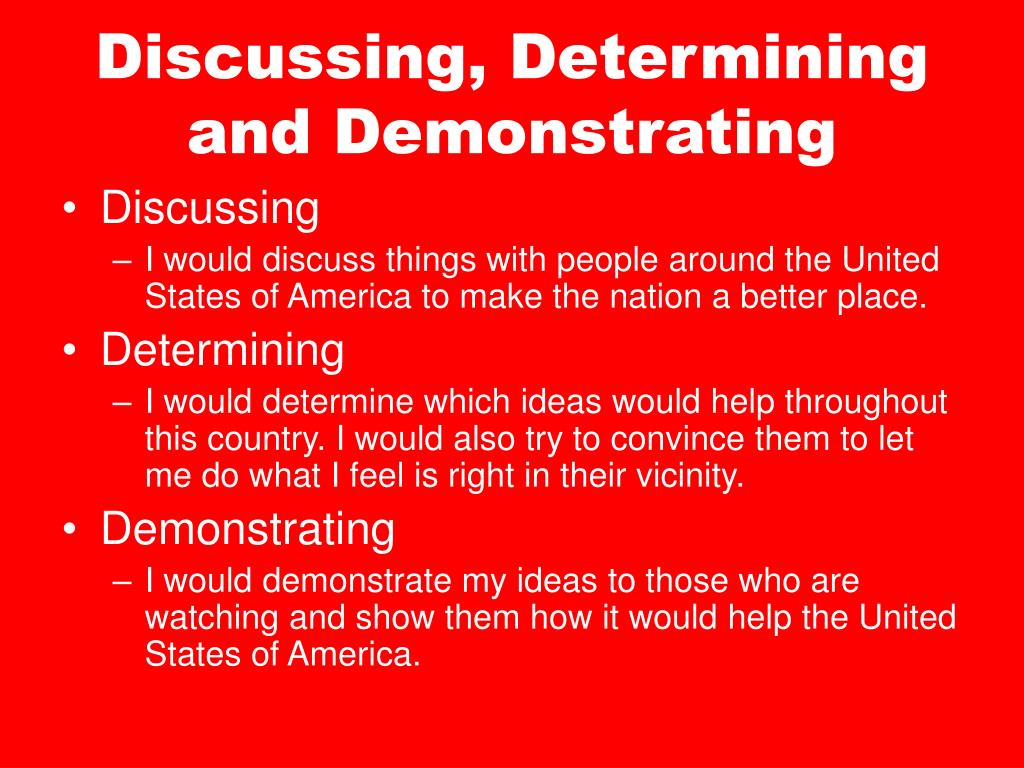 Discussing, Determining and Demonstrating • Discussing • I would discuss things with people around the United States of America to make the nationa better place. • Determining • I would determine which ideas would help throughout this country. I would also try to convince them to let me do what I feel is right in their vicinity. • Demonstrating • I would demonstrate my ideas to those who are watching and show them how it would help the United States of America.