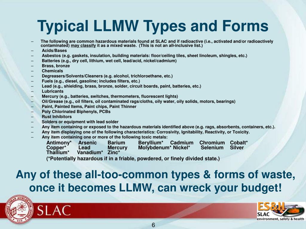 Typical LLMW Types and Forms • The following are common hazardous materials found at SLAC and if radioactive (i.e., activated and/or radioactively contaminated) may classify it as a mixed waste. (This is not an all-inclusive list.) • Acids/Bases • Asbestos (e.g. gaskets, insulation, building materials: floor/ceiling tiles, sheet linoleum, shingles, etc.) • Batteries (e.g., dry cell, lithium, wet cell, lead/acid, nickel/cadmium) • Brass, bronze • Chemicals • Degreasers/Solvents/Cleaners (e.g. alcohol, trichloroethane, etc.) • Fuels (e.g., diesel, gasoline; includes filters, etc.) • Lead (e.g., shielding, brass, bronze, solder, circuit boards, paint, batteries, etc.) • Lubricants • Mercury (e.g., batteries, switches, thermometers, fluorescent lights) • Oil/Grease (e.g., oil filters, oil contaminated rags/cloths, oily water, oily solids, motors, bearings) • Paint, Painted Items, Paint chips, Paint Thinner • Poly Chlorinated Biphenyls, PCBs • Rust Inhibitors • Solders or equipment with lead solder • Any item containing or exposed to the hazardous materials identified above (e.g. rags, absorbents, containers, etc.). • Any item displaying one of the following characteristics: Corrosivity, Ignitability, Reactivity, or Toxicity. • Any item containing one or more of the following toxic metals: Antimony* Arsenic Barium Beryllium* Cadmium Chromium Cobalt* Copper* Lead Mercury Molybdenum* Nickel* Selenium Silver Thallium* Vanadium* Zinc* (*Potentially hazardous if in a friable, powdered, or finely divided state.) Any of these all-too-common types & forms of waste, once it becomes LLMW, can wreck your budget!