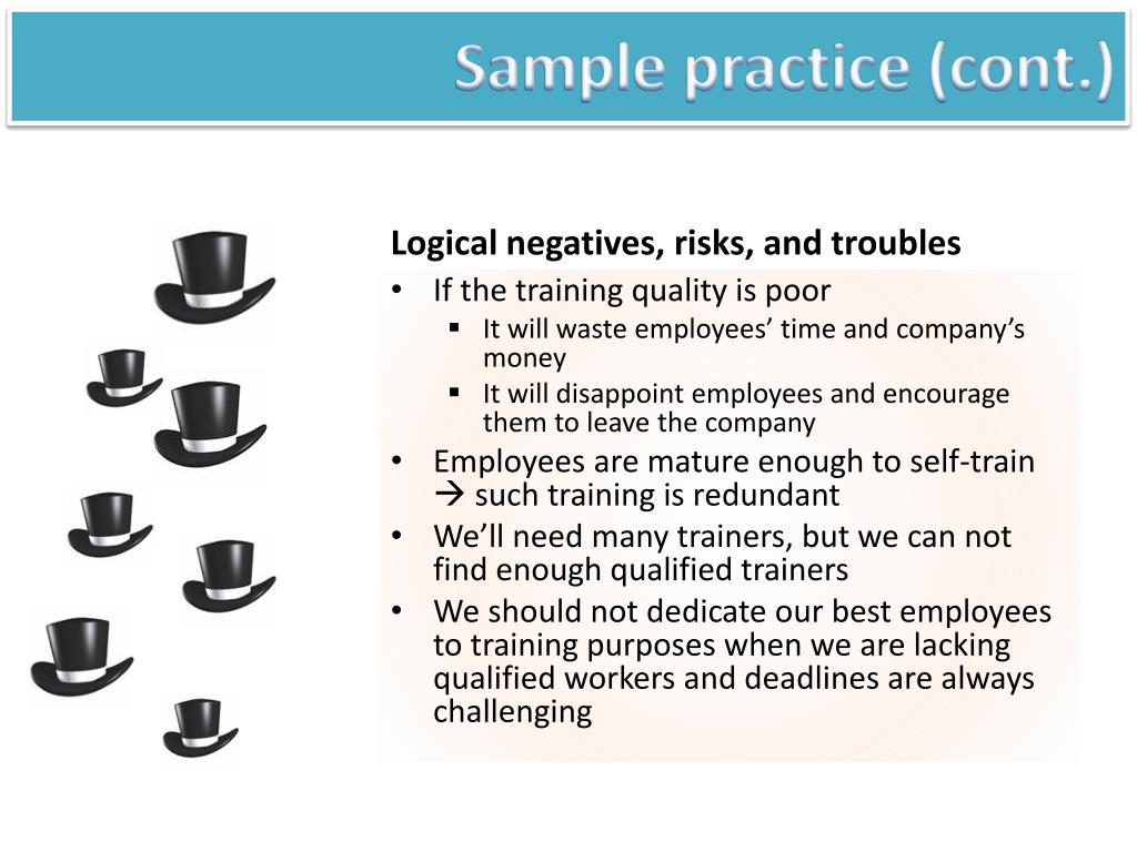 Sample practice (cont.) If the training quality is poor It will waste employees’ time and company’s money It will disappoint employees and encourage them to leave the company Employees are mature enough to self-train such training is redundant We’ll need many trainers, but we can not find enough qualified trainers We should not dedicate our best employees to training purposes when we are lacking qualified workers and deadlines are always challenging Logical negatives, risks, and troubles