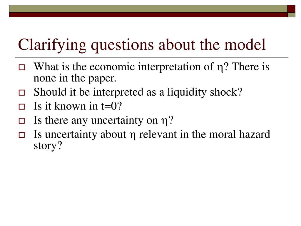 Clarifying questions about the model • What is the economic interpretation of h? There is none in the paper. • Should it be interpreted as a liquidity shock? • Is it known in t=0? • Is there any uncertainty on h? • Is uncertainty about h relevant in the moral hazard story?