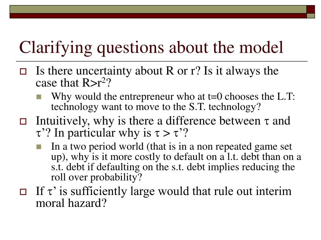 Clarifying questions about the model • Is there uncertainty about R or r? Is it always the case that R>r2? • Why would the entrepreneur who at t=0 chooses the L.T: technology want to move to the S.T. technology? • Intuitively, why is there a difference between t and t’? In particular why is t > t’? • In a two period world (that is in a non repeated game set up), why is it more costly to default on a l.t. debt than on a s.t. debt if defaulting on the s.t. debt implies reducing the roll over probability? • If t’ is sufficiently large would that rule out interim moral hazard?
