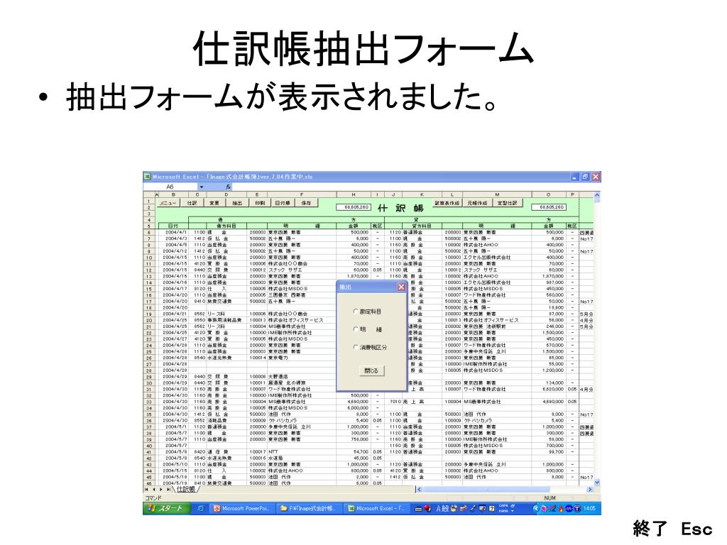 仕訳帳シート画面 • このように仕訳帳に反映しています。 終了 Esc