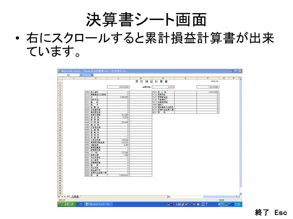 決算書シート画面 • 右にスクロールすると累計損益計算書が出来ています。 終了 Esc